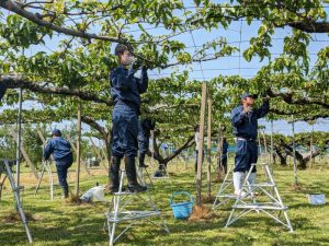 5月13日 果樹研究センターの関口主任専門員より、日本なしの年間作業スケジュールと現在までの作業経過について説明していただきました。その後、園地に移動し、果実の肥大を促進させるための「予備摘果作業」を体験しました。