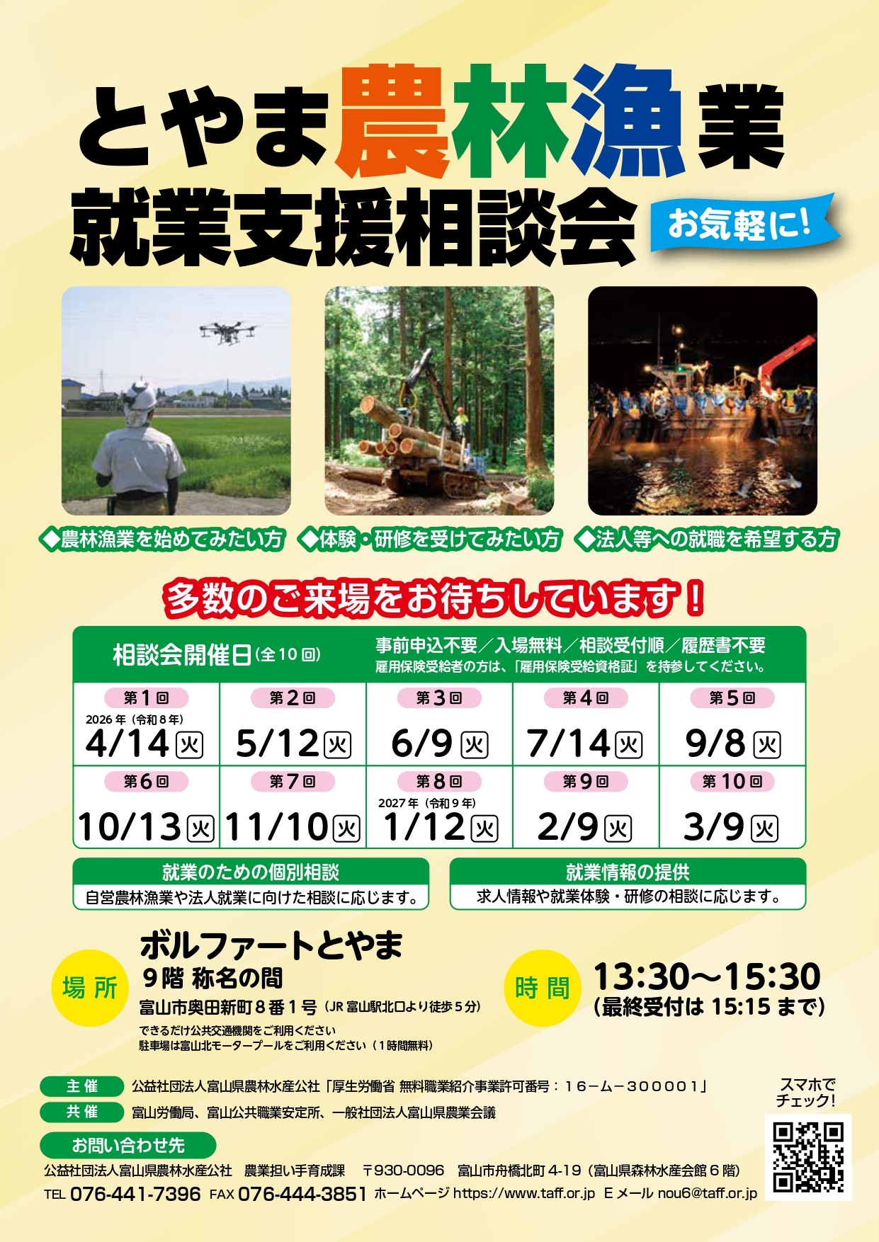 2026年02月05日 令和8年(2026年)度「とやま農林漁業就業支援相談会」の日程 令和8年度の「とやま農林漁業就業支援相談会」の日程をお知らせします。 詳しくは、チラシをご覧ください。ご来場をお待ちしております。