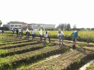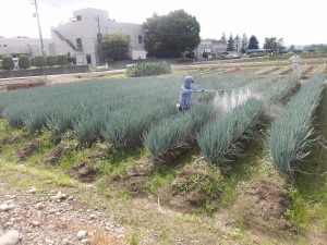 9月11日 動力散布機を用いてハクサイ、キャベツ、ダイコン、ネギの病害虫防除作業を行いました。また、ニンジンほ場の排水溝の手直しも行いました。