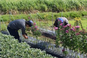 10月2日 (有)中田農園(富山市)にてハウスミニトマト株の撤去作業、スプレーギク(路地)支柱、株の撤去作業を行いました。