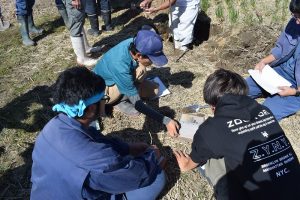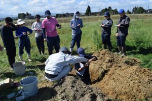 10月9日 農業研究所の2カ所のほ場で土壌断面調査を行いました。まず、地表から1m程度掘り下げた上で、硬さや色などにより土層の境目を見極め、層ごとに硬度などを測定しました。2カ所のほ場の違いについても確認しました。