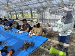 10月17日 富山県園芸研究所(砺波市)で、シャクヤクの収穫および調製の実習を行いました。地域活性化に向けた新たな作物として、シャクヤクの作付けが進められています。今回は、根の機械収穫と調製作業を実習しました。また、調製後に残った母株から潜芽を切り離し、増殖用の苗として調製しました。