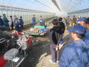 10月24日 (有)林農産(黒部市)の林代表から経営概要を説明していただいた後、白ねぎの機械・施設や里芋の掘り取り現場を見学させていただきました。