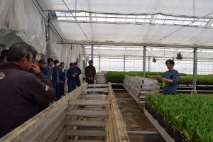 11月6日 (株)センティア(砺波市)にて、チューリップ切り花の生産ラインを見学しながら、伊藤代表から切り花生産拡大の経緯や販売経路、稲作を含めた今後への取り組みについて説明をいただきました。