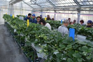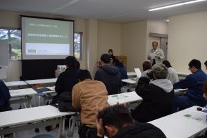 12月5日 イノチオアグリ株式会社(愛知県)の講師を招聘し、一般公募の受講生やカレッジ研修生など18名が参加し第4回ICT園芸講座が開催されました。講師より高設イチゴ栽培における低温期の環境制御と栽培管理のポイントについてご講演いただき、イチゴの生育を促進する二酸化炭素施用や電照補光による収量改善等ついて理解を深めました。また、実習ではイチゴの適切な摘葉・摘花についてご指導頂きました。