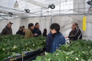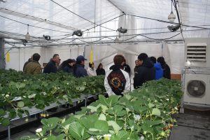 1月27日 (株)環境整備(富山市婦中町)のイチゴ栽培温室を見学しました。約15aの大きな温室では、高設ベンチが設営されており、養液栽培により「よつぼし」920株が管理されていました。温室内の気温、施肥、灌水はすべて自動で行われており、高度にシステム化された環境制御技術を間近に学ぶことができました。
