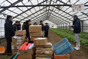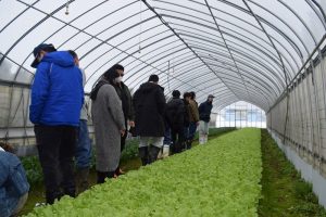 2月9日 株式会社大平園芸の施設園芸を見学しました。白川氏よりハウスの周年利用のための作付け体系(水稲育苗―施設葉菜ー野菜育苗ー施設果菜ー施設葉菜ー販売用野菜苗の育苗ー水稲育苗のサイクル)を現場で説明していただきました。