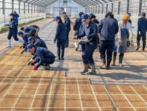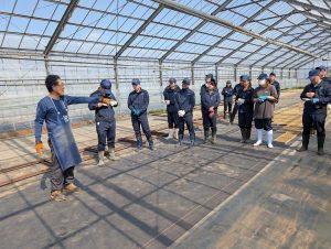 4月8日 富山市の(有)耕和の熊南代表取締役から、水稲の育苗作業の概要について説明いただいた後、苗のハウスへの搬出作業を体験しました。その後、苗の水管理とハウス内の温度管理のポイントを説明いただきました。
