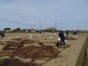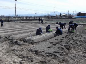 4月9日 指導員から、キャベツの育苗・定植方法、品種特性、土づくりの必要性、堆肥の効果について説明を聞いた後、キャベツの定植と堆肥散布作業を体験しました。