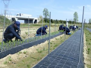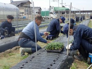 4月20日 (株)中田農園(富山市)で代表取締役の中田拓治さんと前代表の中田貴之さんに指導をいただき、お盆出荷用小ギクの挿し木苗、シンテッポウユリの実生苗を定植しました。