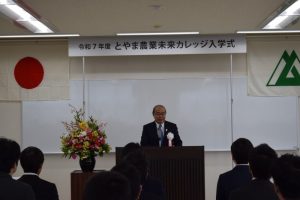 令和7年度の第11期通年研修生22名と第1期園芸経営実践コース研修生1名の入学式を開催しました。新田名誉校長(富山県知事)、延野JA中央会長はじめ、多くの方々が臨席し、門出を祝福しました。喜多研修生(通年)と松田研修生(園芸経営実践コース)が決意表明を行いました。