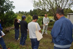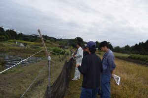 10月7日 農村振興課の中島副主幹から野生鳥獣による農作物被害の状況と防止対策について説明いただいた後、富山県薬用植物指導センター(上市町広野)に設置されている各種の侵入防止柵を見学しました。