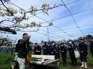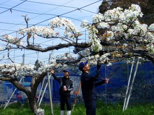 4月14日 こまつな菊ちゃんハウス(射水市)の果樹園にて、ニホンナシ(品種「幸水」)のめしべに、品種「新興」の花粉を人工授粉しました。